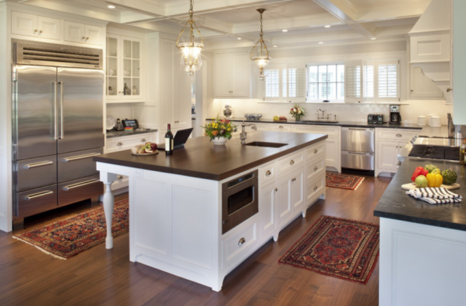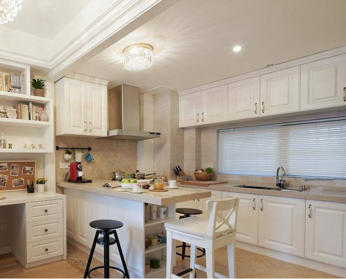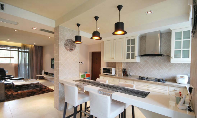 此类型厨房一般会在开口拐角处设计一个吧台,其大小则视厨房大小而定。吧台本是西方装修设计要素,将其用在厨房装修中可谓非常巧妙。它的优点是美观性、省钱、安全、娱乐、充分利用空间以及方便,但也存在着难打理、污染重等弊端。